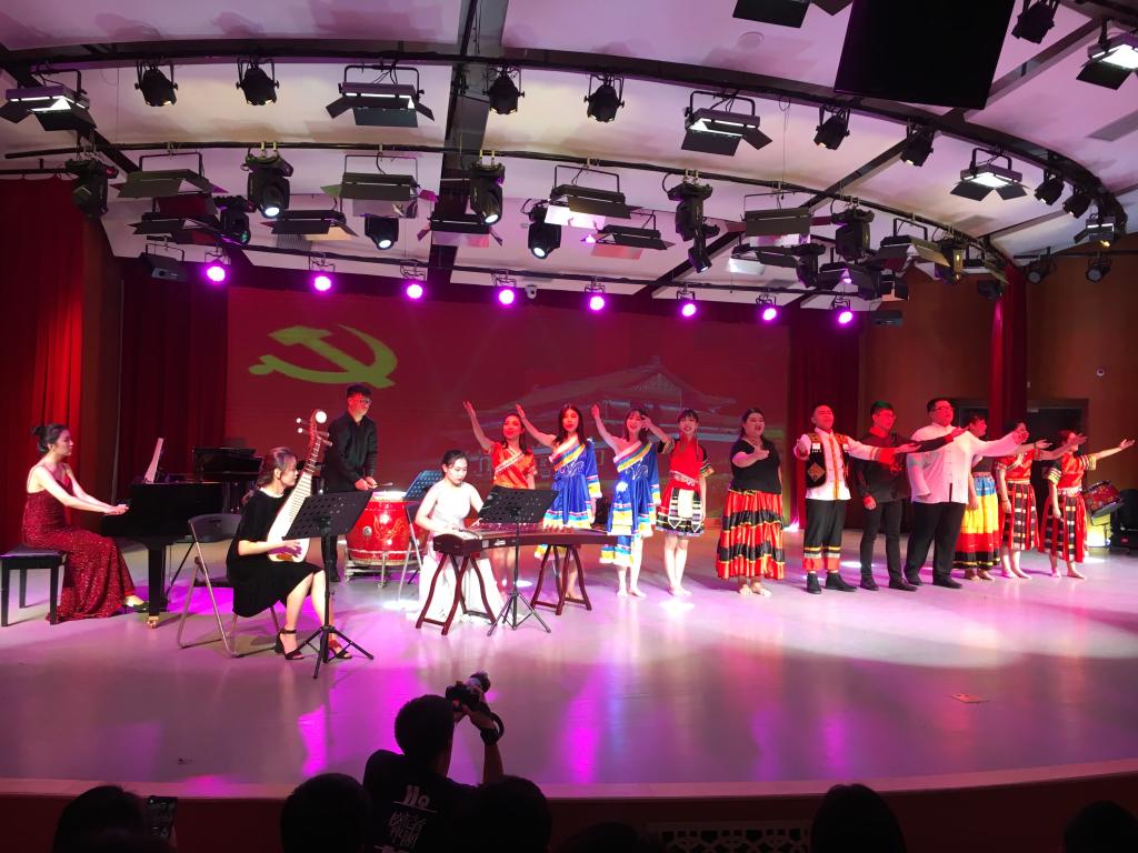 当《唱支山歌给党听》《三月桃花心中开》《映山红》等耳熟能详的旋律响起时,不少观众随着音乐小声哼唱。由董雨萌和游文豪带来的女声二重唱《今天是你的生日》,2017级音乐学专业全体境外生也共同参与了演出,表达对伟大祖国的深深祝福。“能参与其中很激动,祝福我们伟大的祖国繁荣昌盛”,参演的车瑞盈激动地向记者表示。她与游文豪都是来自中国香港。