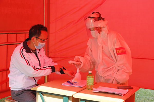 在临时留观区为发热学生检测体温