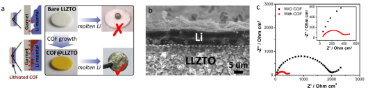 (a)有/无COFs修饰的固态电解质与熔融锂的浸润性。(b)有COFs修饰层的固态电解质与熔融锂的良好接触。(c)电化学阻抗谱对比。