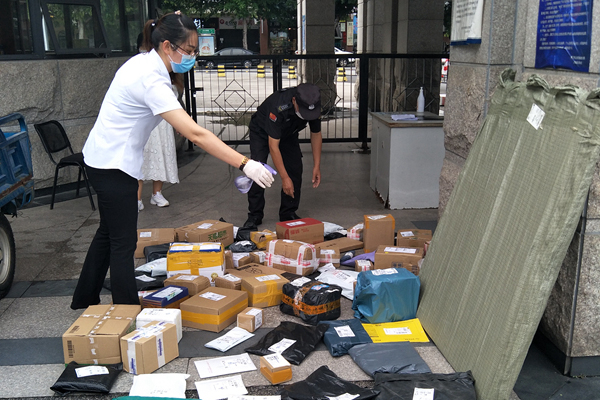 安保人员为包裹消毒
