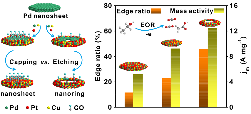 该工作中,研究人员发展了一种可控性极强的超薄二维PdPtCu三元合金纳米结构的合成方法,成功制备厚度仅为2.0纳米左右的PdPtCu纳米片和纳米环。通过对反应动力学、表面修饰和选择性刻蚀的一体化控制,实现了PdPtCu纳米片和纳米环的尺寸精准调控和形状选择。在保留组分均一性的前提下,二维PdPtCu纳米结构的边缘面积比例从11.74%逐步提高到23.11%和45.85%,为研究边缘不饱和配位原子位点的EOR催化活性提供了理想的模型催化剂体系。