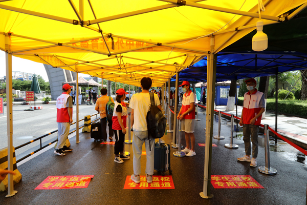 志愿者引导返校学生上接送专车