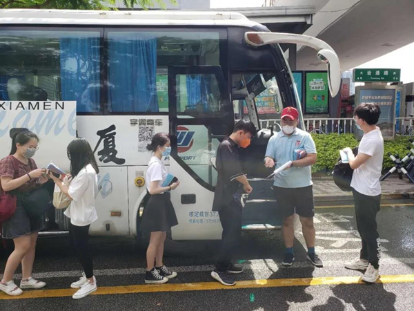 学校在泉州动车站、泉州晋江机场、厦门动车站、厦门机场等地提供接车服务,机场、车站的出口都设有醒目的标语、引导牌,学生出站后由老师引导等候,统一组织上车,并建立微信群进行实名登记和管理。“我们想以接新生的方式来迎接所有的毕业生,为大家营造一个回家的氛围。”校学生处相关负责人如是说。