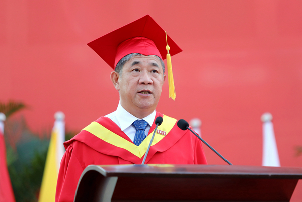 医学院/生物医学学院林胜辉、建筑学院欧达毅作为教师代表分别致辞。林胜辉结合教师与医生的身份鼓励毕业生们学会正确认识自己、认识社会、认识自然,叮嘱大家珍视自己的身体健康。欧达毅则告诫毕业生们,人生不会一帆风顺,未来的挑战还会有很多,“早一天学会面对,你就从容不迫;早一天能够适应,你将与众不同。”
