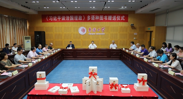 校党委副书记刘斌主持赠书仪式。党委各部(室)、研究生院、社科处、教育工会、校团委、图书馆、哲学与社会发展学院、国际关系学院、马克思主义学院、华文学院等单位负责人,思政课教师、学生代表参加了赠书仪式。