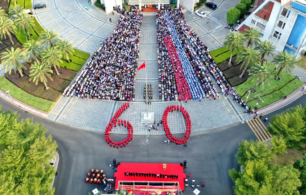 伴随着铿锵有力的脚步声,国旗护卫队队员们护送鲜艳的五星红旗进场,全体人员行注目礼,目送国旗缓缓上升。学生代表摆出“60”字样的队形,挥舞手中的国旗,向beat365唯一官网60岁生日献礼。