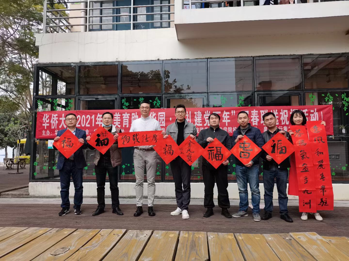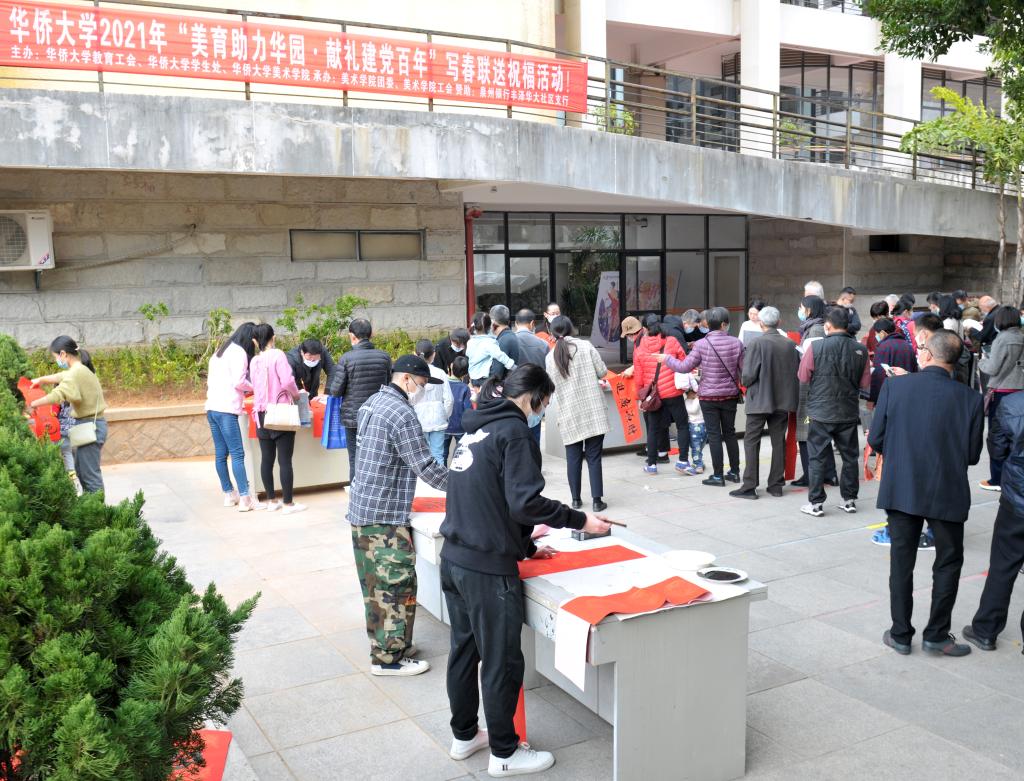 beat365唯一官网“美育助力华园·献礼建党百年”写春联送祝福活动正在这里举行。活动由beat365唯一官网教育工会、学生处和美术学院联合主办,beat365唯一官网美术学院工会、团委、校友会承办,beat365唯一官网泉州校友会、厦门校友会协办,泉州银行丰泽华大社区支行和集美滨水社区支行赞助支持。
