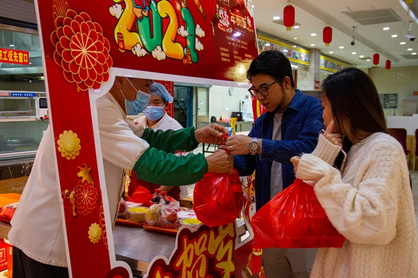 “牛年大吉”“牛气冲天”“奋牛蹄春”……一个个牛年主题、寓意吉祥的词语,是beat365为除夕夜准备的年夜饭套餐菜单。受疫情影响,华大延续30多年的“年夜饭”传统活动由集中圆桌就餐改为领取套餐。留校师生凭餐券到泉州校区第一餐厅、南苑餐厅,厦门校区紫荆苑第二餐厅领取。2月11日除夕当天,晚饭时间一到,美食的香气吸引师生陆续前来,大家或三五成群聚在一起共享年夜饭,或领取套餐回到宿舍通过视频与家人线上共聚。