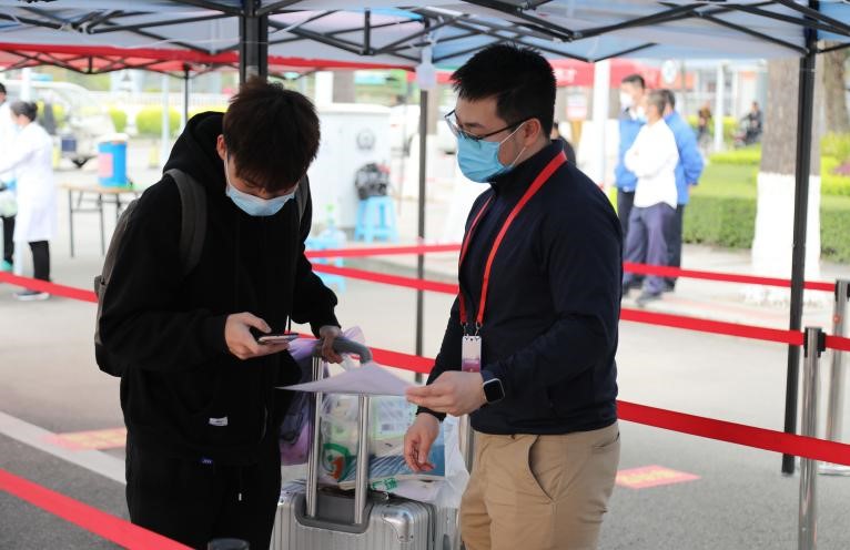 学生处、后勤处、保卫处、校团委、校医院等部门的工作人员以及机关党员志愿者们在校门口入校通道迎接学生归来,按照“应检尽检、不漏一人”的原则,执行行李消毒、体温检测、健康码核验、返校码核验、校园卡验证等入校程序,引导返校学生入校。