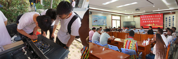 同时,信息学院还利用走进鸿渐村的机会,积极服务乡村。其中,维多利小家电义务维修队为当地村民免费维修家电;学生党员代表为村里的小学生开展党史小课堂,讲述了抗战小英雄的事迹等;留学生代表则与小学生们分享了“我和中国的故事”。学院还联合鸿渐村开展了侨校侨村学党史展览、学习党史趣味游园等活动,丰富村民文化生活。