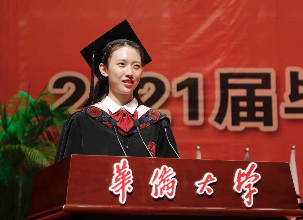 大家下午好!我是来自经济与金融学院2017级的陈子涵,今天能够作为毕业生代表站在这里发言,我感到无比荣幸和激动。首先,我谨代表2021届全体毕业生,向培养我们的母校、向教诲呵护我们的师长,致以最崇高的敬意和最诚挚的感谢!