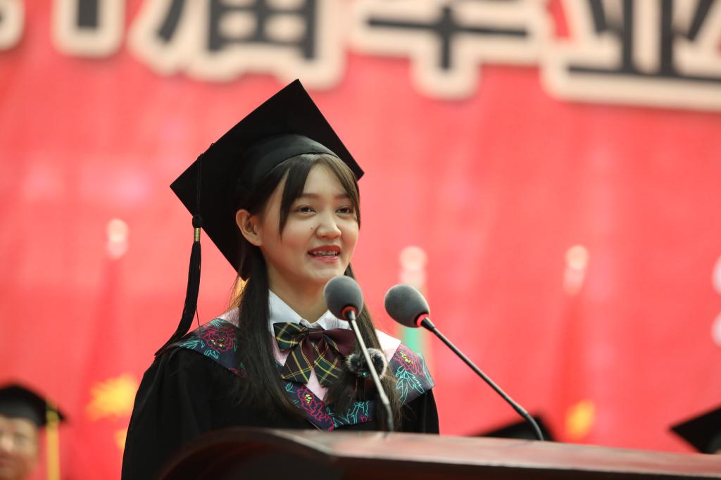 最后,请允许我代表全体毕业生衷心的祝愿:祝愿我们的母校人才辈出、华章永续;祝愿各位老师工作顺利、桃李芬芳;祝愿我们自己,以梦为马、不负韶华、前程似锦!归来仍是少年!