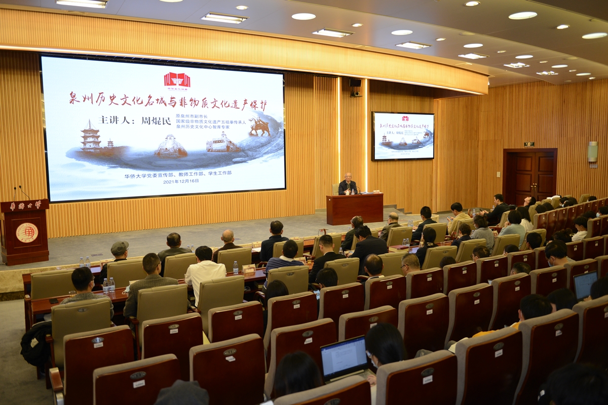 启动仪式后,周焜民以《泉州历史文化名城与非物质文化遗产保护》为题,作“中华文化讲堂”首场报告。报告中,他以文化为切入点,全面解读泉州历史文化名城保护的人文意义和历史价值。他认为,随着申遗成功,泉州历史文化名城的保护有了质的提升,那就是打造一个世遗典范城市。要遵循世界遗产公约,保护泉州世界遗产的历史真实性和完整性,秉持修旧如旧的原则,不仅保护好申遗点,而且保护好申遗点的环境,以及与之相关的城市格局、建筑、文脉、风貌,历史文化街区,保护第一,永续利用和发展。而在非物质文化遗产的保护方面,周焜民表示,“我们很多非物质文化遗产面临着随着社会的变革和发展而出现减弱甚至消亡的危险。”他提出,除了整个古城的历史风貌外,非物质文化遗产的保护也应该同时纳入我们的古城保护中,同步进行。