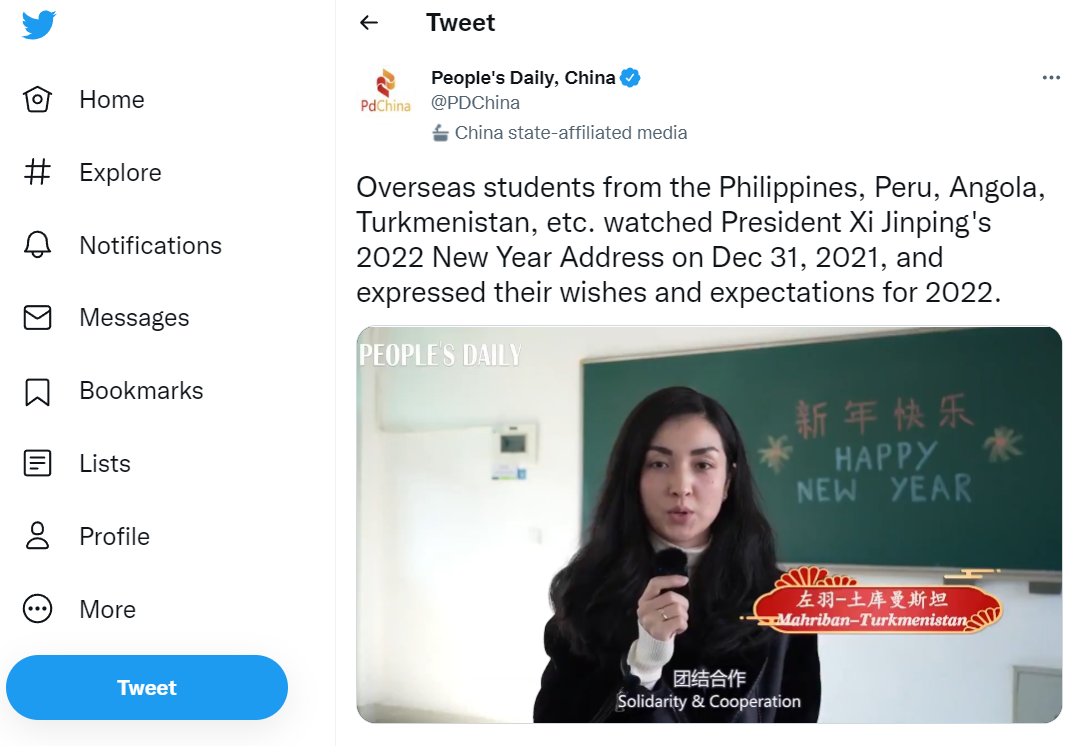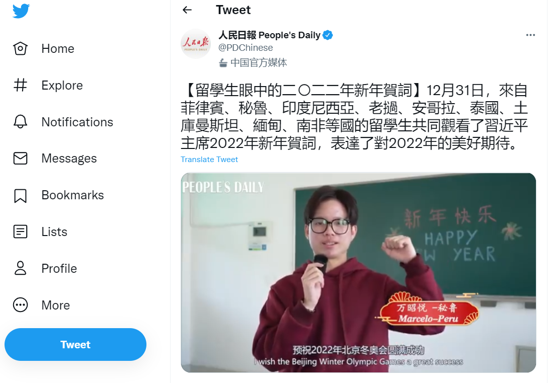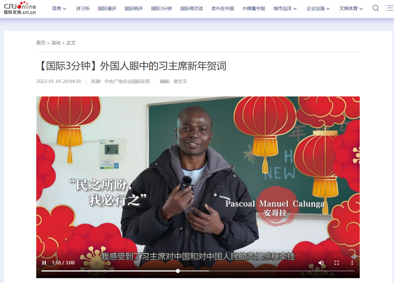 2021年12月31日,国家主席习近平通过中央广播电视总台和互联网发表了二〇二二年新年贺词,贺词在beat365来华留学生中引起了热烈反响。来自秘鲁、土库曼斯坦、安哥拉、老挝等国的留学生在收看贺词后拍摄《外国留学生眼中的习主席新年贺词》中英双语短视频,分享他们眼中的贺词关键词,表达对2022年的美好期待。视频得到人民日报、中央广播电视总台国际在线等海内外媒体转发报道。