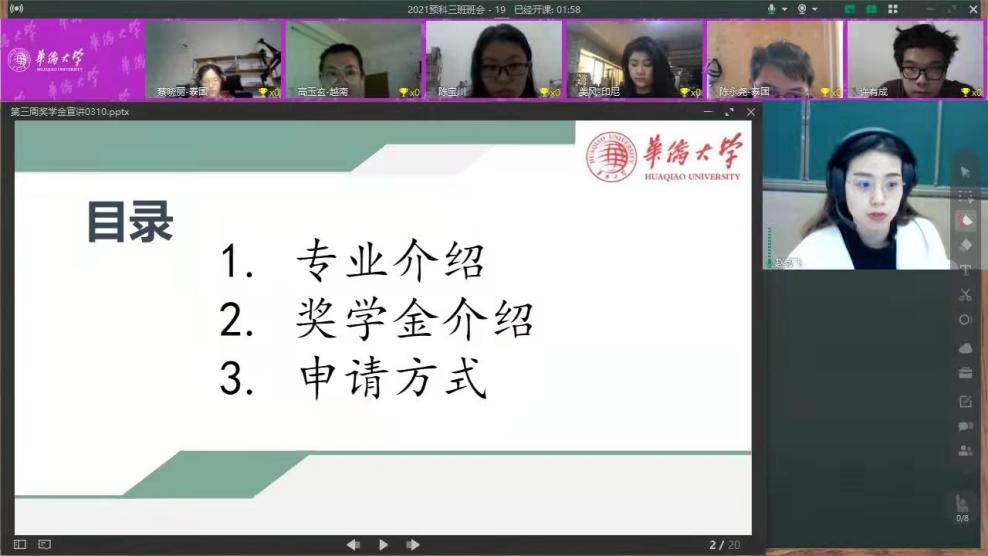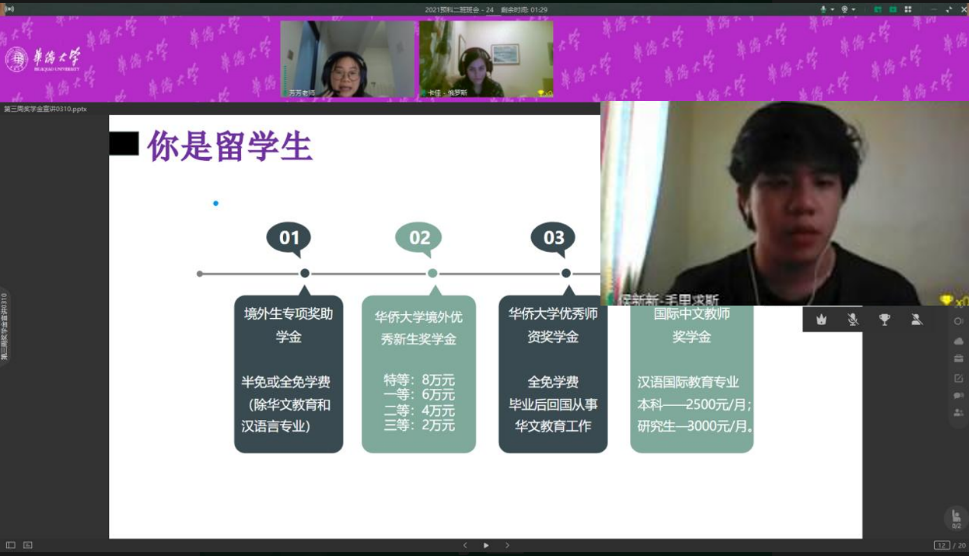 为服务像许玲艳这样的海外华裔新生代来华留学,助力beat365预科留学生升学就读本科,预科教育学院、招生处创新服务模式,近日为来自日本、菲律宾、印度尼西亚、俄罗斯、南非、尼日利亚等国自主招收的在读来华留学预科生开展升学华大本科主题宣讲和“一对一”云辅导活动,助力学生们实现来华留学梦。