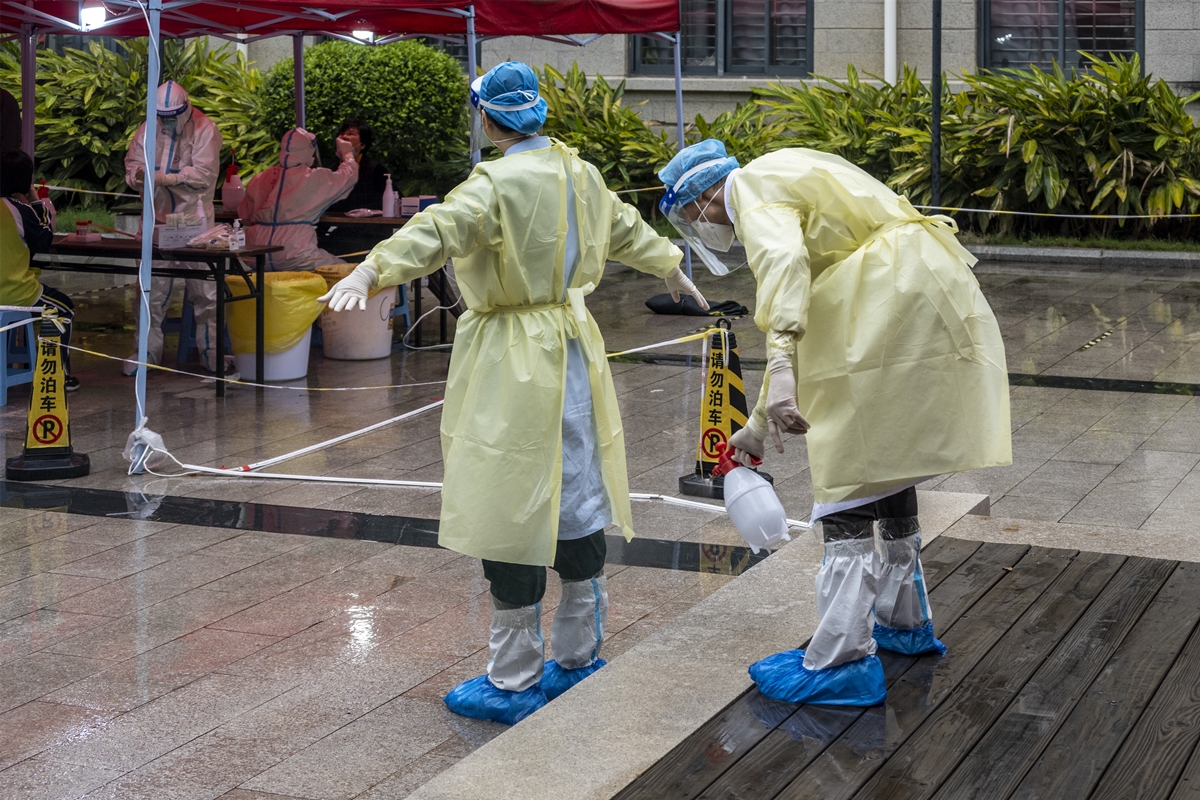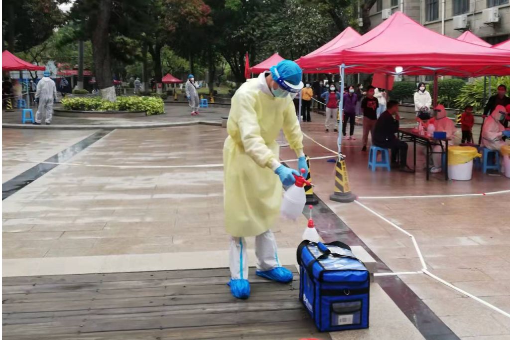 这两个人,均来自校医院,前者是信息科负责人陈文泽,后者为药剂科科长朱逊贤。但在核酸检测场上,他们有一个共同的身份——“控场员”。