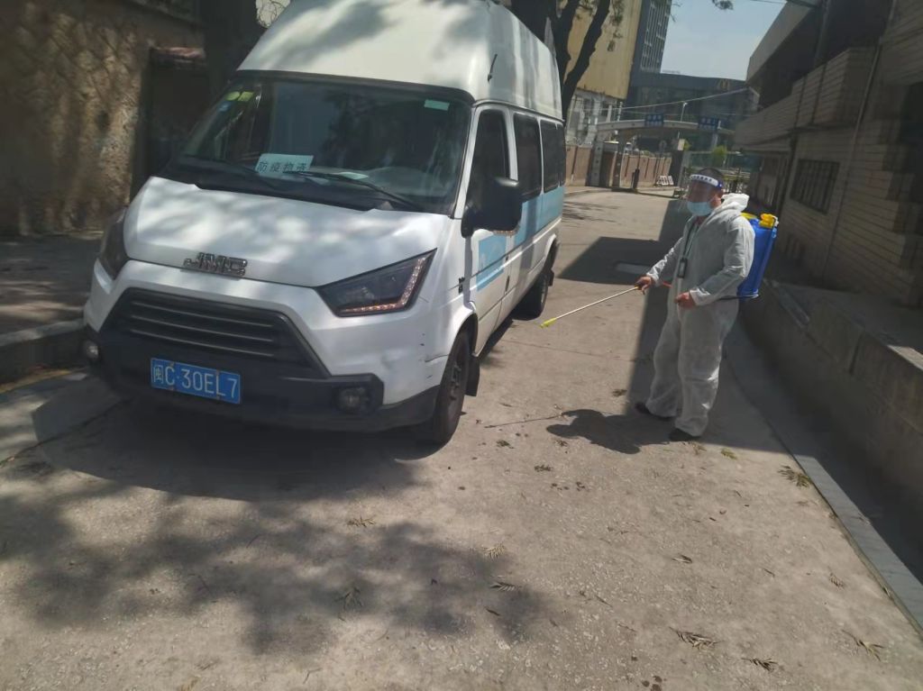 在北区物资中转站,一车车的生活物资陆续运入校内,保障着校内上万名师生员工的生活必需,有一个已经上了年纪却依旧挺拔的身影,他拿着消杀设备,围着运输车辆认真的做着消杀工作,生怕漏过任何一个角落。