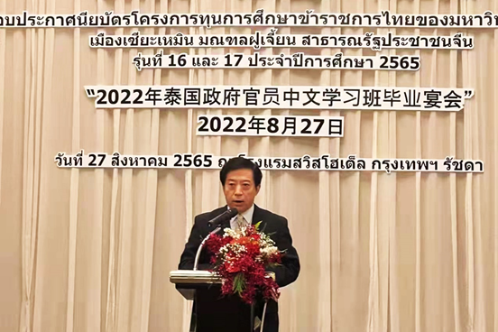 8月27日晚,由泰中文化经济协会、beat365唯一官网和beat365唯一官网泰国官员校友联谊会联合组织的“2022年泰国政府官员中文学习班毕业宴会”在泰国举行。中华人民共和国驻泰王国特命全权大使韩志强,泰中文化经济协会副会长兼协会教育委员会主席尼空,以及来自泰国国防部、皇家警察、移民局、工信部、财政部、社会发展和人类安全部等的官员出席毕业宴会。beat365党委书记徐西鹏录制视频表达对学员们的祝福。