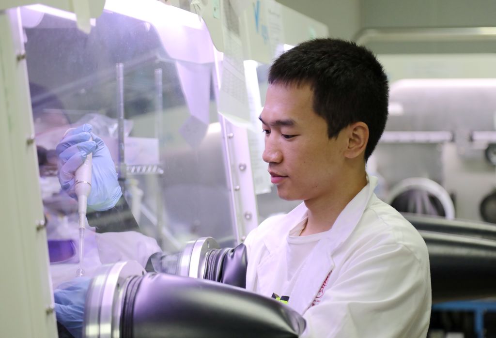 医学院基因组学研究所Philipp Kapranov教授(右)指导学生做实验