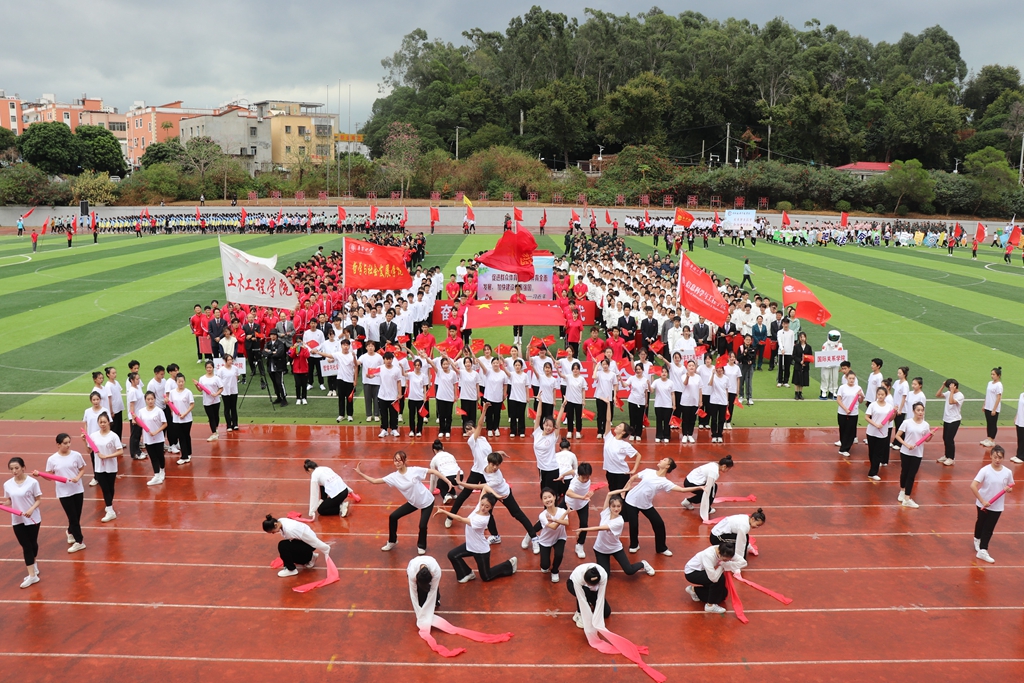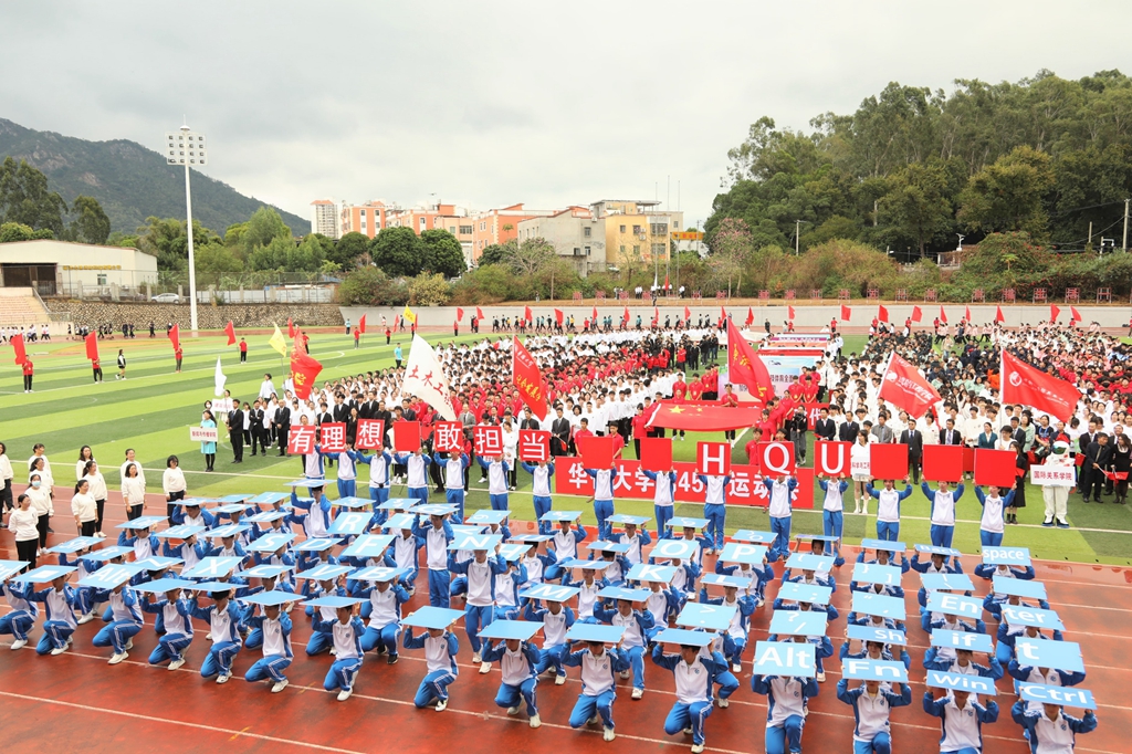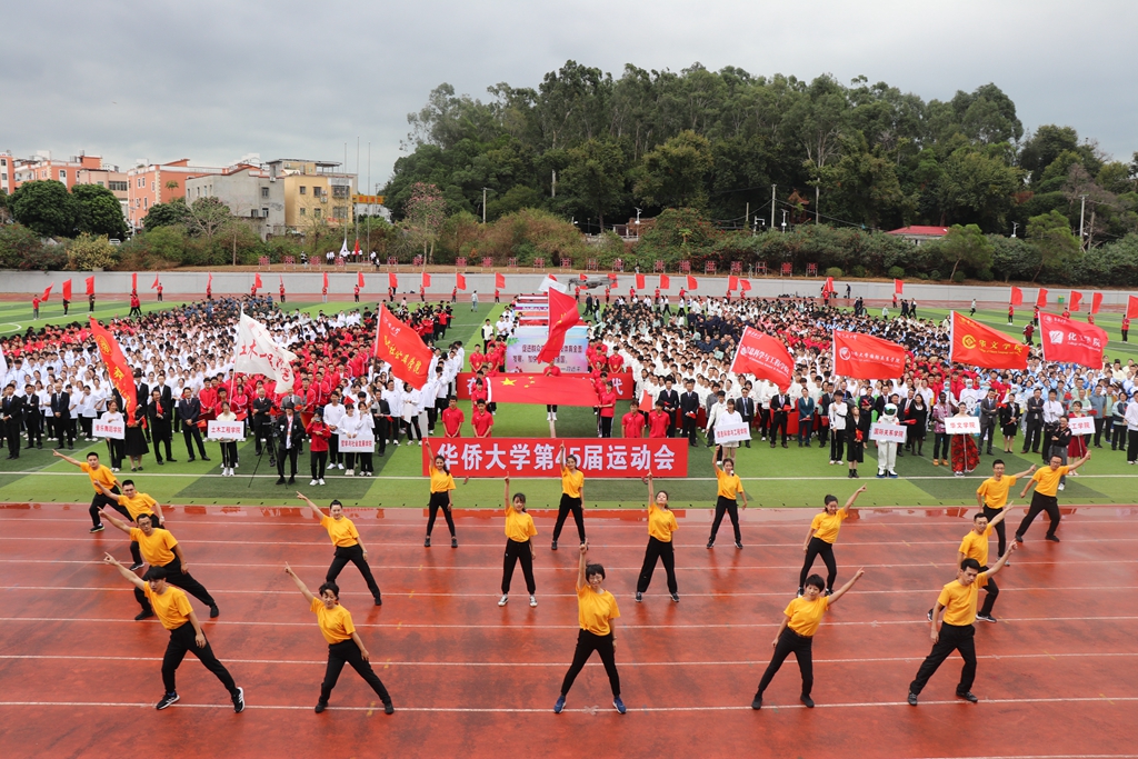 团体操表演中,1100名华大学子组成方阵翻转四色圆扇,聚拢五角之星,彰显青春活力;舞龙表演,气势如虹,“我爱beat365唯一官网”的造型道出了华大学子对学校的真挚情感;原创排舞《领航》表演,表达了华大学子对党、对国家的深情与热爱;百余名教职工齐跳《奋斗吧中国》,展现新时代华大教职工信仰坚定、奋进新征程的昂扬姿态。