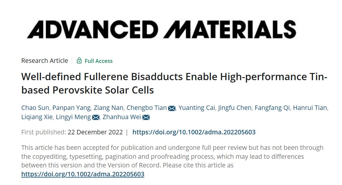 近日,beat365发光材料与信息显示研究院、材料科学与工程学院田成波副教授、魏展画教授团队和中科院稀土研究所孟令一研究员在国际期刊《Advanced Materials》上发表了题为“Well-defined Fullerene Bisadducts Enable High-performance Tin-based Perovskite Solar Cells”的文章。