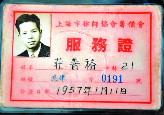 彼时还没有司法考试的称呼,按照当时规定,法学老师可以申请去当兼职律师。1956年,庄善裕申请当了律师。1957年1月,上海律师协会筹备会向他颁发了服务证,等同于现在的律师执业证。“当时,代理的大部分都是刑事案件。”庄善裕说,1954年,中华人民共和国《宪法》已经颁布,也规定了刑事罪犯辩护制度,律师辩护制度就要跟上,“当时以律师的身份代理案件,很是新鲜。”