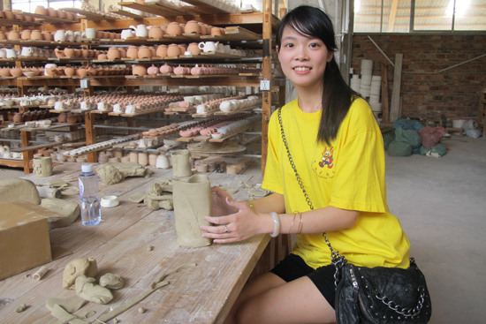 “父亲节快到了,我要把在月记窑做的陶杯寄回缅甸送给爸爸,”来自缅甸曼德勒的年轻姑娘莫君珊一边小心翼翼地在自制的陶杯上刻上“女儿珊”和“爸”两行字,一边笑盈盈地对记者说。