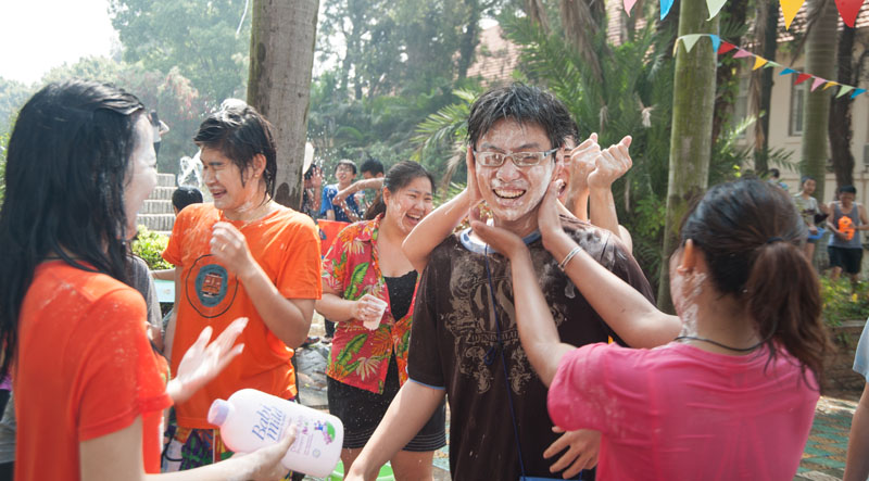 上午9时许,华文学院诗琳通图书馆前成了一片欢乐的海洋。在充满东南亚风情的动感音乐中,穿着节日盛装的泰国留学生们,载歌载舞,尽情地将象征吉祥的清水泼向同伴、朋友,希望将快乐与好运带给对方,在飞溅的水花中播撒欢乐,庆祝2014年佛历新年。来自泰国的大二学生黄伟生告诉记者,“虽然远离自己的家乡,但在这里也能够过自己国家的新年,让我很快乐、很开心,跟这么多同学在一起度过,跟在我们家乡欢度新年一样。”而就读于大三的泰国留学生苏惠娴则介绍说,学校经常举办不同国家特色活动,不仅很热闹、有趣,还可以让学生了解不同国家的文化。