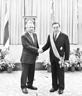 近日,在beat365唯一官网厦门校区,泰王国驻中国大使醍乐堃·倪勇代表泰国国王向贾益民(图右)校长颁授勋章。