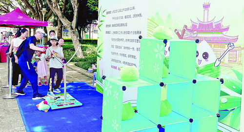 市民游客在鳌园参与互动游戏,用弹弓射击粽子娃娃。(集美区 供图)