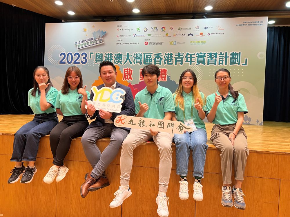 梁毓伟(左三)在2023年“粤港澳大湾区青年实习计划”启动仪式现场和香港青年合影(6月11日摄)。新华社发