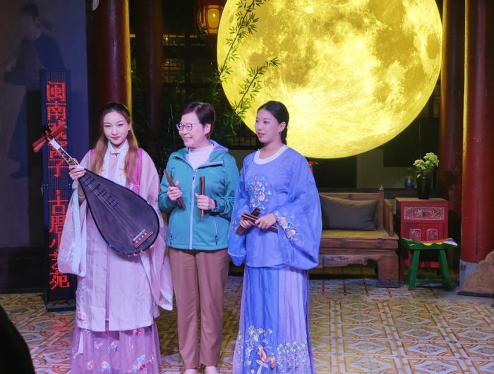 11月18日晚,林郑月娥一行莅临泉州古城,在印记闽南文化驿站欣赏世界级非遗泉州提线木偶及南音,与非遗老师交流互动并亲自上台体验,点赞泉州非遗文化魅力。