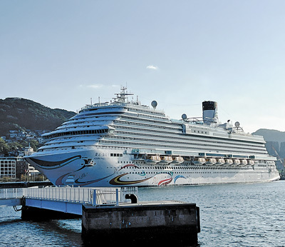 1月7日,国产首艘大型邮轮“爱达·魔都号”搭载3000多名宾客,完成7天6晚的商业首航。图为商业首航中停靠港口的“爱达·魔都号”邮轮。