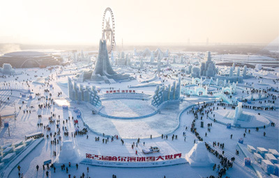黑龙江哈尔滨冰雪大世界占地81万平方米,25万立方米的冰和雪幻化成上百个精美景观。