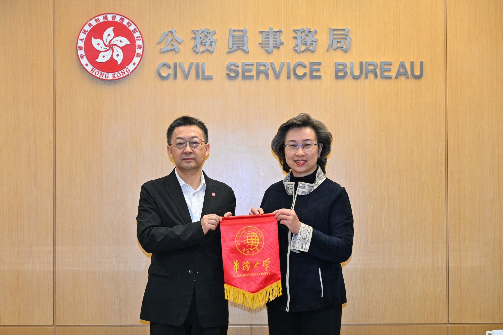 【點新聞報道】公務員事務局局長楊何蓓茵今日(26日)上午與由華僑大學黨委書記徐西鵬教授率領的代表團於政府總部會面,就加強向在該大學就讀的香港學生宣傳特區政府公務員招聘的相關資訊作交流。