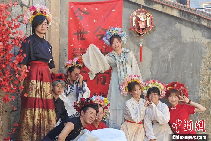 7月11日,海峡两岸青年师生在泉州蟳埔民俗文化村,体验“簪花围”。 吴冠标 摄