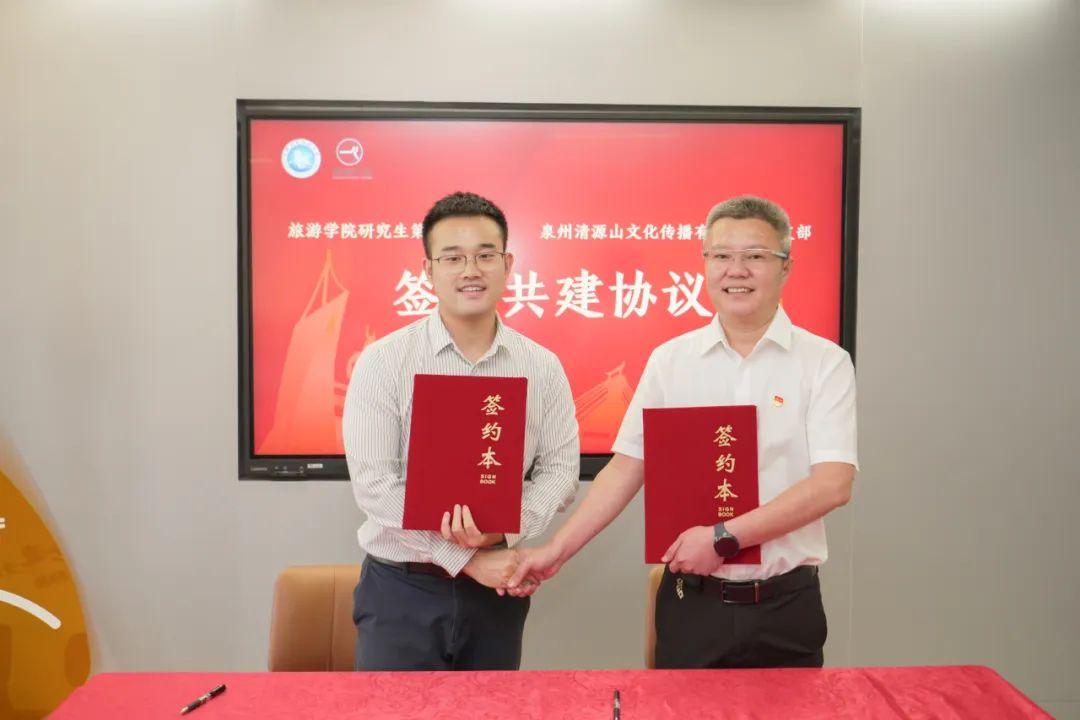 beat365唯一官网旅游学院研究生第一党支部书记孙丛强与泉州清源文传党支部书记庄清群共同签订党支部共建协议。