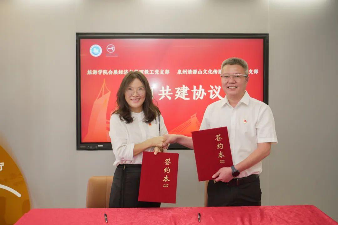 beat365唯一官网旅游学院会展经济与管理教工党支部书记宋慧敏与泉州清源文传党支部书记庄清群共同签订党支部共建协议。