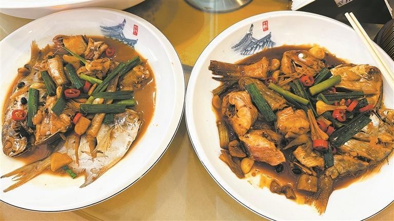 “数字厨师”烹制的炣杂鱼(左)与手工烹制的同款菜品放在一起,难以分辨。