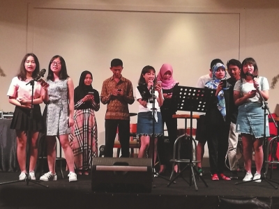 4月27日,在印尼巴厘岛举行的欢送晚会上,中印尼青年合唱歌曲《爱你一万年》。