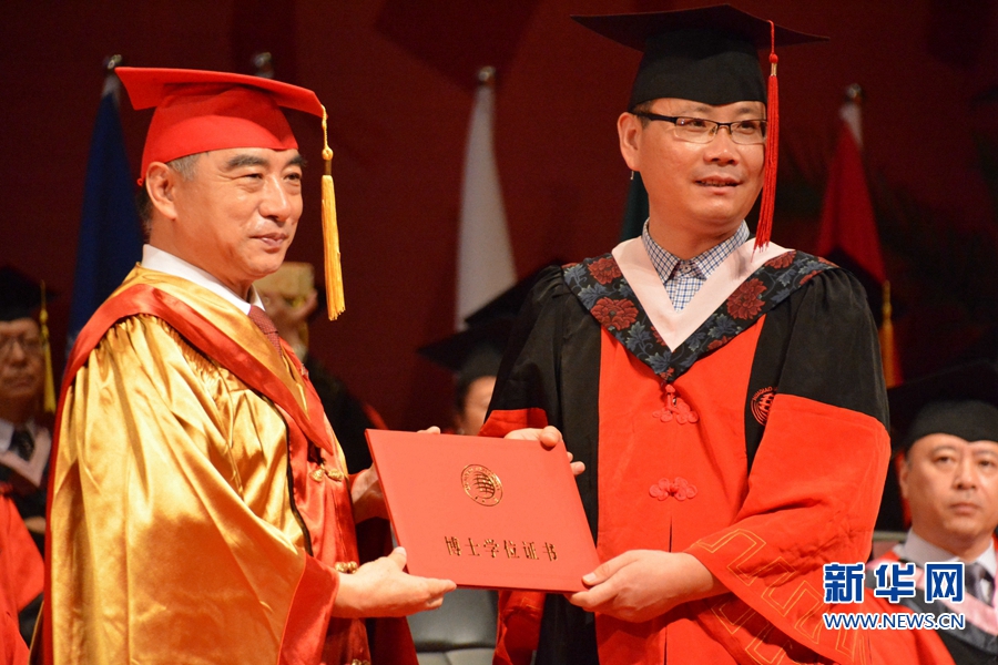 华大校长贾益民为毕业博士授予学位证书。新华网发(林楷煜 摄)