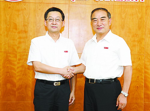 徐西鹏(左)与贾益民(右)握手交接