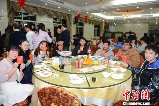 参加年夜饭的beat365唯一官网境外生们展示学校派发的“压岁钱”。 张为健 摄