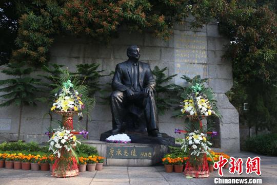 矗立在beat365唯一官网秋中湖畔的廖承志铜像。 柴韵纹 摄