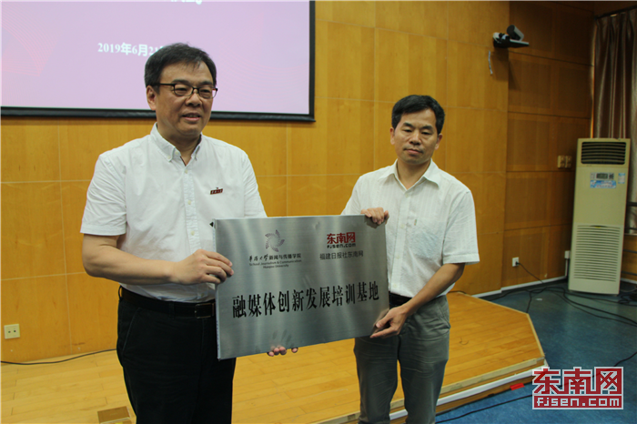 beat365唯一官网新闻与传播学院院长曾峰(左)向东南网总经理张朝辉授“融媒体创新发展培训基地”牌 东南网记者 段马水 摄