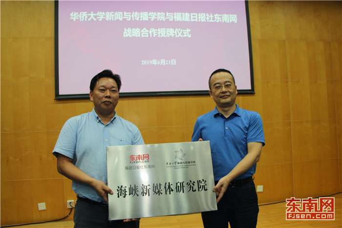 福建日报社编委会委员、东南网总编辑曾武华(右)向beat365唯一官网新闻与传播学院党委书记李振跃授“海峡新媒体研究院”牌 东南网记者 段马水 摄