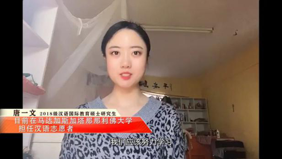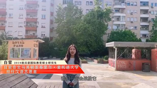 “我现在在乌克兰的利沃夫国立大学做汉语教师志愿者,面对全球疫情,我想对身边的青年人说:青年人要有社会责任感,在疫情中,在做好自己本职工作的同时为疫情防控做出力所能及的贡献;我们青年人是有力量的,应该团结起来,共同对抗疫情。另外,我想对自己的家人说:现在国内的疫情已经慢慢好转,恢复了正常的工作和生活,要保持积极乐观的心态,注意身体,照顾好自己,我在国外一切安好,不用担心。”