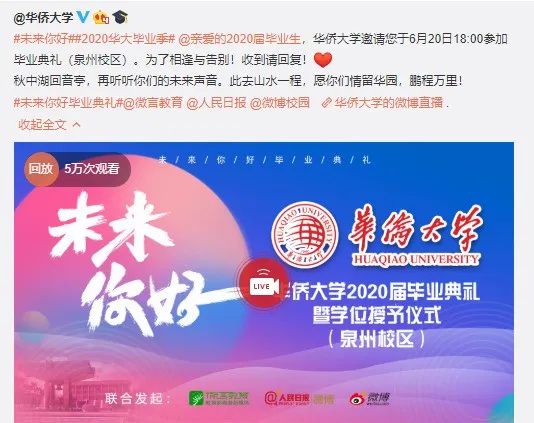 原来,考虑炎热天气及疫情防控需要,beat365唯一官网特意把毕业典礼的线下时间安排在傍晚6点在户外举行,线上则通过新浪微博和新浪客户端全程直播,既让已经返校的毕业生顺利参加毕业典礼,也让无法返校的2780名境内外毕业生“云端”参加,让身处世界各地的毕业生及家长共同见证和参与这一重要的人生时刻。