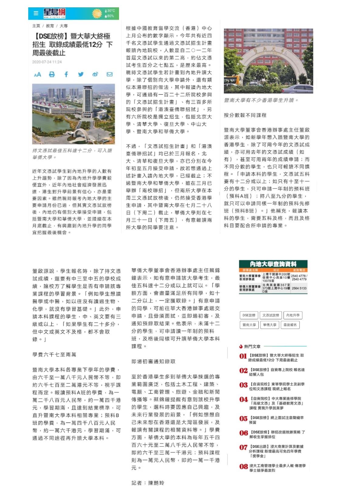 暨南大学董事会香港办事处主任董启源表示,如新学年想入读暨南大学的香港学生,除了可用今年的文凭试成绩,亦可用去年的文凭试成绩(如有),甚至可用两年的成绩申请;而不同分数的学生,也只可报读不同课程。「申请本科的学生,文凭试五科要有十二分或以上;如只有十至十一分的学生,只可申请一年制的预科班(预科A班);持八至九分的学生,就只可以申请同样一年制的预科先修班(预科B班)。」他补充,报读本科的学生,需要五科及格,而且及格科目要配合所申请的专业。