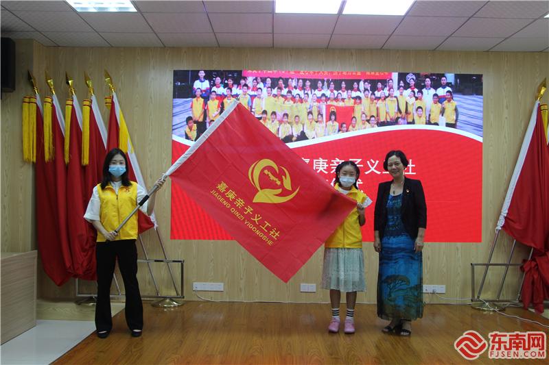 集美区妇联主席王汴玉为嘉庚亲子义工社志愿者、社工代表授旗。(东南网记者 李霖 摄)